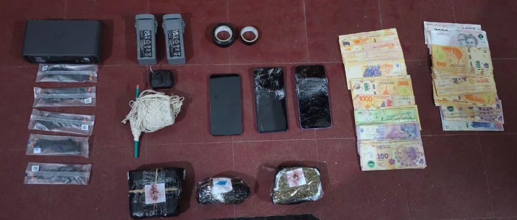 Como resultado del procedimiento, se procedió al secuestro de envoltorios con clorhidrato de cocaína y picadura de marihuana (uno de ellos compactado), tres teléfonos celulares, cinco pares de hélices de dron con dos baterías, un ovillo de hilo de algodón, cintas aisladoras y una trincheta, elementos presuntamente destinados al intento de ingreso de estupefacientes al complejo carcelario.