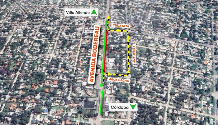 El tránsito será desviado hacia calle Agua Sacha, luego girar a la izquierda en Antucura y posteriormente Cruz Alta para retomar la trayectoria por Bodereau. Es importante aclarar que entre esas calles no se verá afectada la circulación de quienes transiten con en sentido Villa Allende – Córdoba.