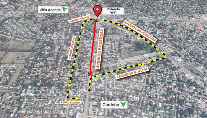 En tanto, quienes transiten en desde Villa Allende hacia Córdoba, deberán utilizar las calles Manuel Gálvez, luego Manuel Pizarro y posteriormente Pedro Goyena, y desde allí acceder a la Avenida Bodereau.