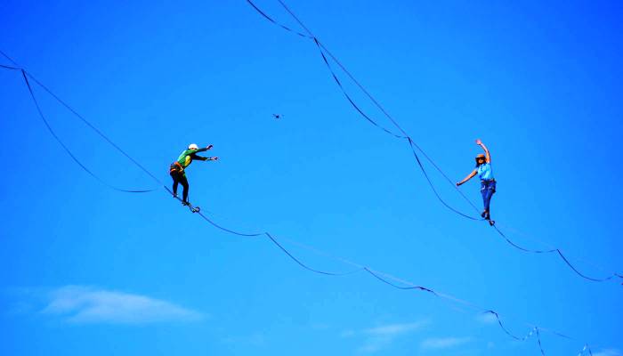La modalidad, que consiste en recorrer 100 metros sobre una cinta de apenas una pulgada de ancho suspendida a más de 30 metros de altura, puso a prueba a los atletas en cada pasada, donde el tiempo y la concentración fueron determinantes.