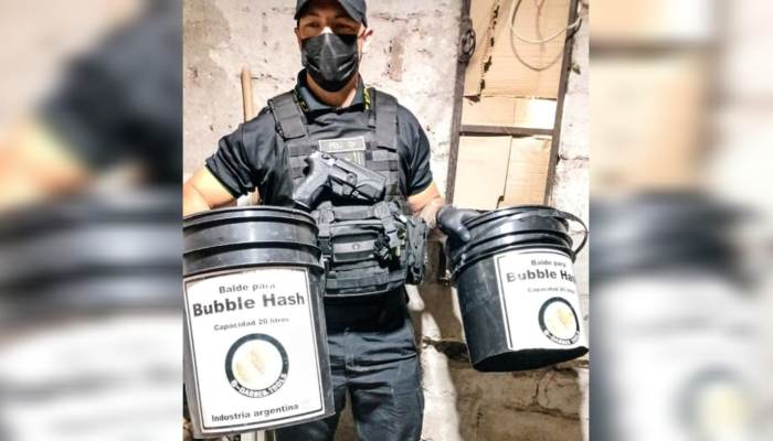 Además, los investigadores desmantelaron un laboratorio narco que producía una droga derivada de la marihuana llamada «Bubble Hash» e incautaron una prensa, dos termómetros digitales, tres temporizadores, ocho plafones, dos cooler, un sistema de vigilancia (un dvr, cuatro cámaras y un monitor), dos kilos de fertilizantes, 37 recipientes, siete focos, dos transformadores, un ventilador, cuatro bombas de agua, ocho filtros, dos extractores de aire, 30 litros de agua desmineralizada, un lavarropa y un freezer que eran utilizados para el proceso de elaboración.