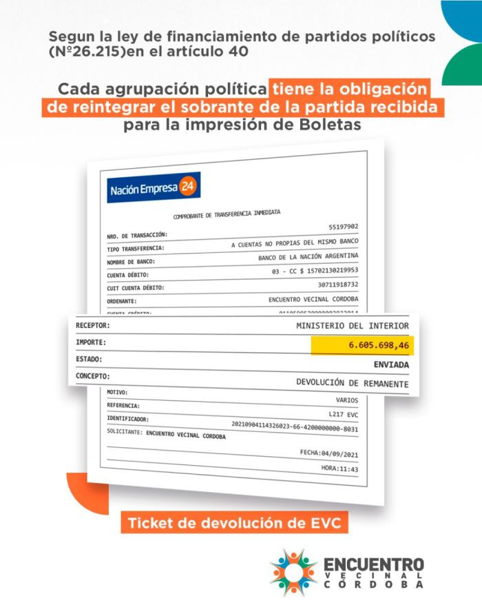 Encuentro Vecinal Córdoba, partido que lleva como primer pre-candidato a Diputado Nacional a Aurelio García Elorrio y como primer pre-candidato a Senador a Juan Pablo Quinteros, devolvió el dinero sobrante de la impresión de boletas para las elecciones PASO 2021.