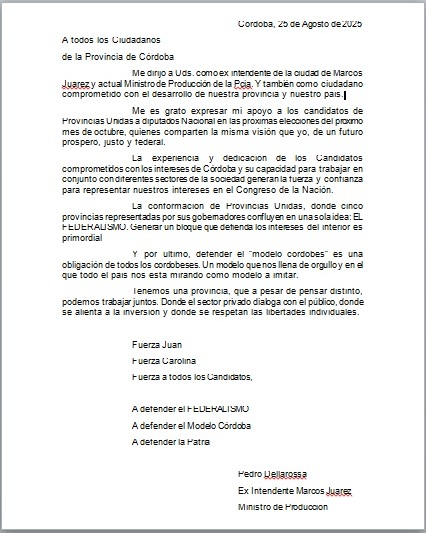 Me dirijo a Uds. como ex intendente de la ciudad de Marcos Juárez y actual Ministro de Producción de la Pcia. Y también como ciudadano comprometido con el desarrollo de nuestra provincia y nuestro país.