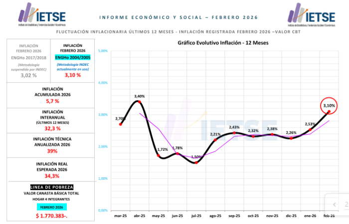 Desde el Centro de Almaceneros Autoservicios y Comerciantes Minoristas de Córdoba informaron que en Febrero de 2026, su Instituto de Estadísticas y Tendencias Sociales y Económicas (IETSE) determinó una inflación mensual de 3,1 %.