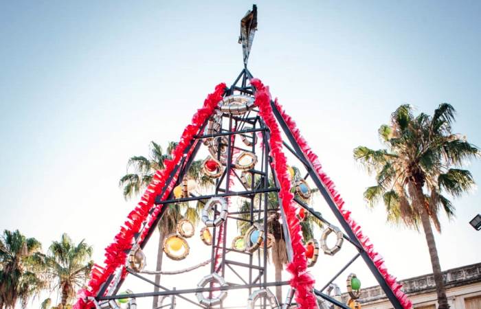 Como novedad se incorporan guirnaldas, confeccionadas con más de 150.000 tapitas que están perforadas y enhebradas, que luego van a ser recicladas.