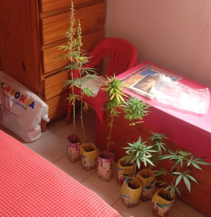 Asimismo, en el interior de la vivienda se constató la presencia de numerosas plantas de Cannabis Sativa por lo que colaboró en el lugar personal de la Fuerza Policial Antinarcotráfico (FPA). Se secuestraron 92 frascos que contenían material orgánico, semillas, varias plantas disecadas, 14 plantines, 122 envoltorios de nylon con cierre hermético conteniendo cogollos, que en un total sumaban 10 kg de material.