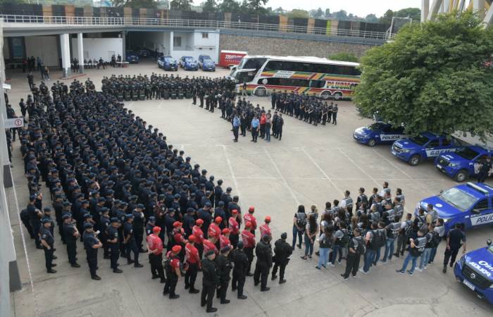 Personal de Guardia de Infantería de la Policía de Córdoba mantiene una reunión de trabajo en las afueras del estadio, preparando el dispositivo de seguridad para recibir a los hinchas de ambos equipos.