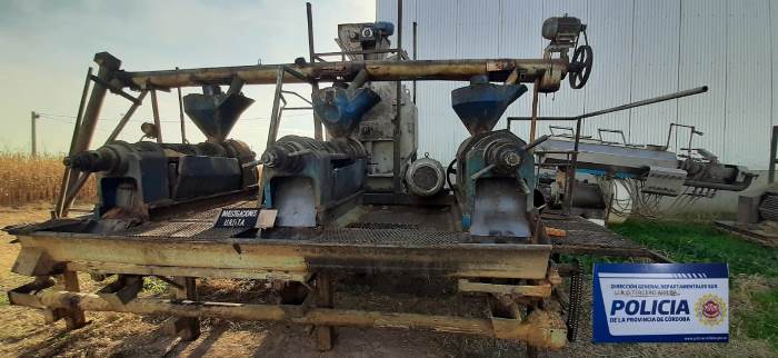 De acuerdo a lo informado por la Dirección Prensa de la Policía de Córdoba, en las últimas horas, personal de la Departamental Tercero Arriba con colaboración de efectivos de la Patrulla Rural Sur realizó un allanamiento en zona rural de la localidad de Oncativo, en relación a un ilícito que se investiga. Se procedió al secuestro de un moledor, tres prensas, una estructura de chimango, una extrusora de maíz, entre otros elementos.