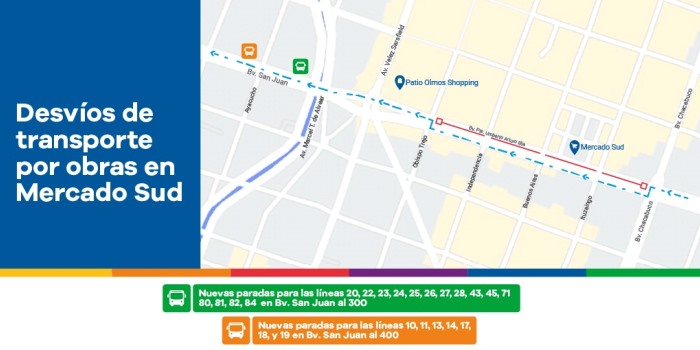 La Municipalidad de Córdoba añadió nuevas paradas de colectivos para optimizar el tiempo y traslado de pasajeros mientras perduren las obras de nivelación de calzada frente al Mercado Sud.