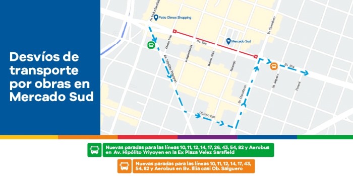 - Las líneas 54 y 82 de Tamse; las líneas 10, 11, 12, 14 y 17 de Coniferal; las líneas 26 y 43 de Ersa; y Aerobus: continúan por Av. Hipólito Yrigoyen, luego Obispo Oro, carril derecho de Bv. Chacabuco, Bv. Arturo Illia y transitan su ruta habitual.