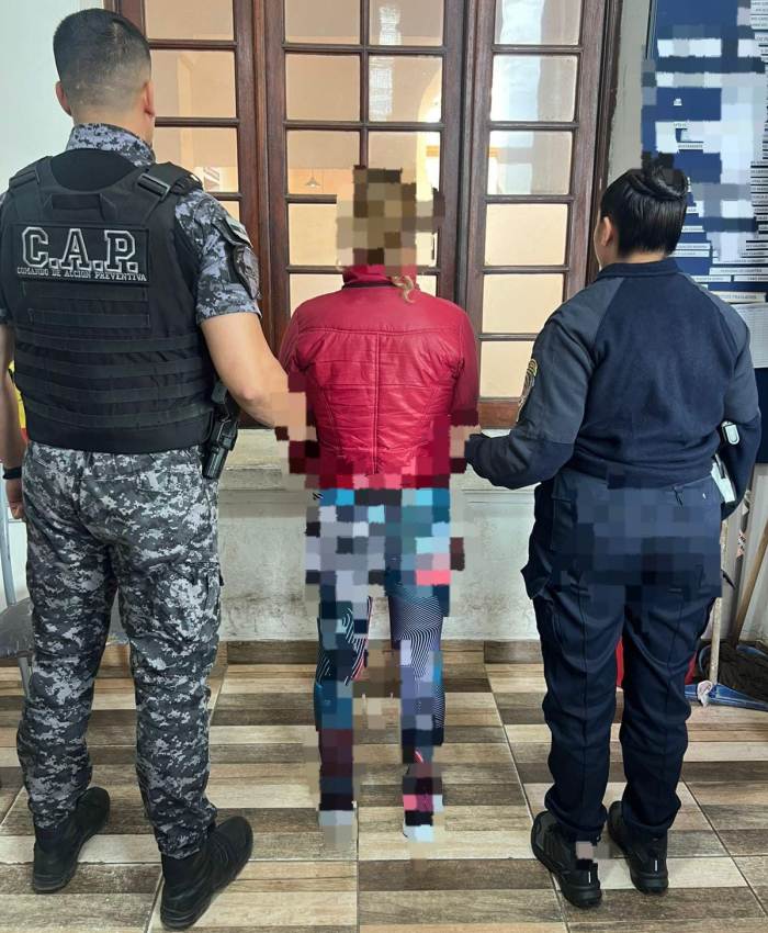 El procedimiento se desarrolló en la intersección de las calles Eduardo Marquina y Francisco López Correa, luego de que el chofer alertara a las autoridades tras ser convocado hacia ese sector. Con los datos aportados, el operador del sistema de cámaras de videovigilancia 911 logró ubicar a los sospechosos, quienes fueron rápidamente interceptados por los efectivos mientras intentaban huir.