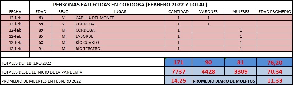 Este sábado se notificaron 6 fallecimientos por Covid-19 en la provincia de Córdoba, todos decesos que se evaluarán si correspondieron a la patología Covid-19 como causa base. De ese total 2 fueron varones y 4 mujeres, todas personas que se encontraban internadas.