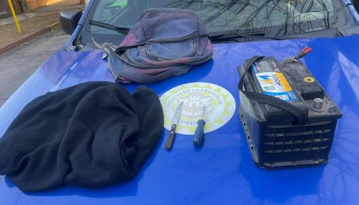 La Dirección de Relaciones Institucionales de la Policía de Córdoba informó que en la víspera, en calle Hipólito Vieytes al 400 de barrio Obrero, tras un patrullaje preventivo personal policial detuvo a un hombre de 27 años. En el lugar se secuestró un arma blanca, un destornillador, una prenda de vestir, una mochila y una batería que habría sustraído de un automóvil marca Fiat Fiorino estacionada en la vía pública. Por tal motivo, el detenido fue trasladado a sede policial quedando a disposición del magistrado interviniente.