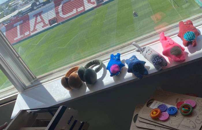 Se entregaron tres sordinas (protectores auditivos para filtrar el ruido), tres muñecos y dos bases de descarga; además de cuatro spinners de plástico reciclado, que colaboran en la liberación emocional y canalizan la ansiedad; y cinco planchas troqueladas para armar animales autóctonos, realizados con cartón recuperado en la Escuela Municipal de Economía Circular.