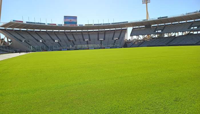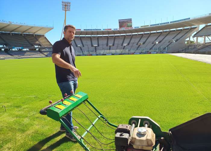 En este momento el presidente de la Agencia Córdoba Deportes, Agustín Calleri, junto al ingeniero Marcos Ibáñez, supervisa el trabajo final sobre el campo de juego del estadio Mario Alberto Kempes.