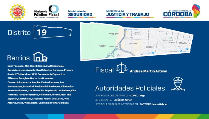 En el nuevo Distrito 19 estarán los barrios San Francisco, Alto Alberdi, Santa Ana Residencial, Carola Lorenzini, Avenida, San Rafael, Los Naranjos, Primera Junta, El Trébol, Juan XXIII, Comandante Espora, Los Plátanos, Ameghino Norte, Los Granados, Consorcio Esperanza, Ampliación Los Plátanos, Los Jacarandaes, Lamadrid, Residencial San Roque, Villa Avalos, Anexo Las Palmas y Los Filtros.