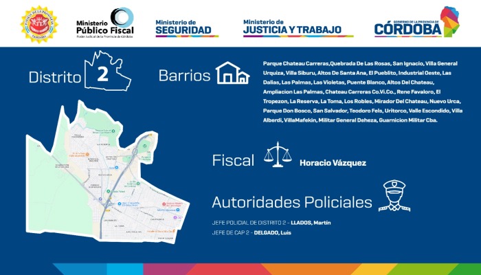 En el nuevo Distrito 2 estarán comprendidos los barrios Parque Chateau Carreras, Quebrada De Las Rosas, San Ignacio, Villa General Urquiza, Villa Siburu, Altos De Santa Ana, El Pueblito, Industrial Oeste, Las Dalias, Las Palmas, Las Violetas, Puente Blanco, Altos Del Chateau, Ampliación Las Palmas, Chateau Carreras, Co.Vi.Co., René Favaloro, El Tropezón, La Reserva, La Toma, Los Robles, Mirador Del Chateau, Nuevo Urca, Parque Don Bosco, San Salvador, Teodoro Fels, Uritorco, Valle Escondido, Villa Alberdi, Villa Mafekin, Barrio Militar General Deheza y Guarnición Militar Córdoba.